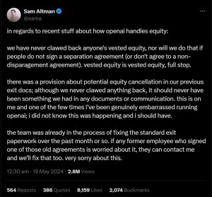 تیم طی یک ماه گذشته در حال اصلاح اسناد خروج استاندارد بوده است. اگر هر کارمند سابق OpenAI که یکی از آن توافقنامههای قدیمی را امضا کرده است، در این مورد نگران است، میتواند با من تماس بگیرد و ما آن را نیز اصلاح خواهیم کرد. بابت این موضوع بسیار متاسفم.