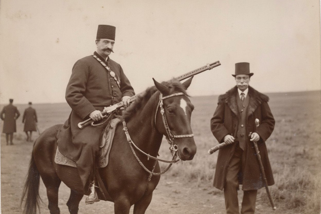 موتورسواری ناصرالدین شاه و نوهاش (احمد شاه) در منطقه دوشانتپه (خیابان دماوند فعلی) / از آرشیو موقوفه استاد جلال افشار.